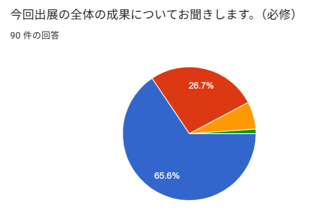 参加させて頂きまなぶことも多く、よかったなと思うのですが、弊社に決算から間もない為、出店準備が満足にできなかったことが問題でした。次回も時期の問題で、準備不足になる可能性は非常に高いのが悩ましいです。