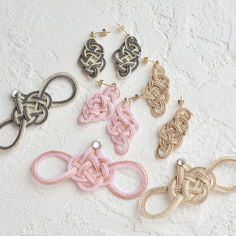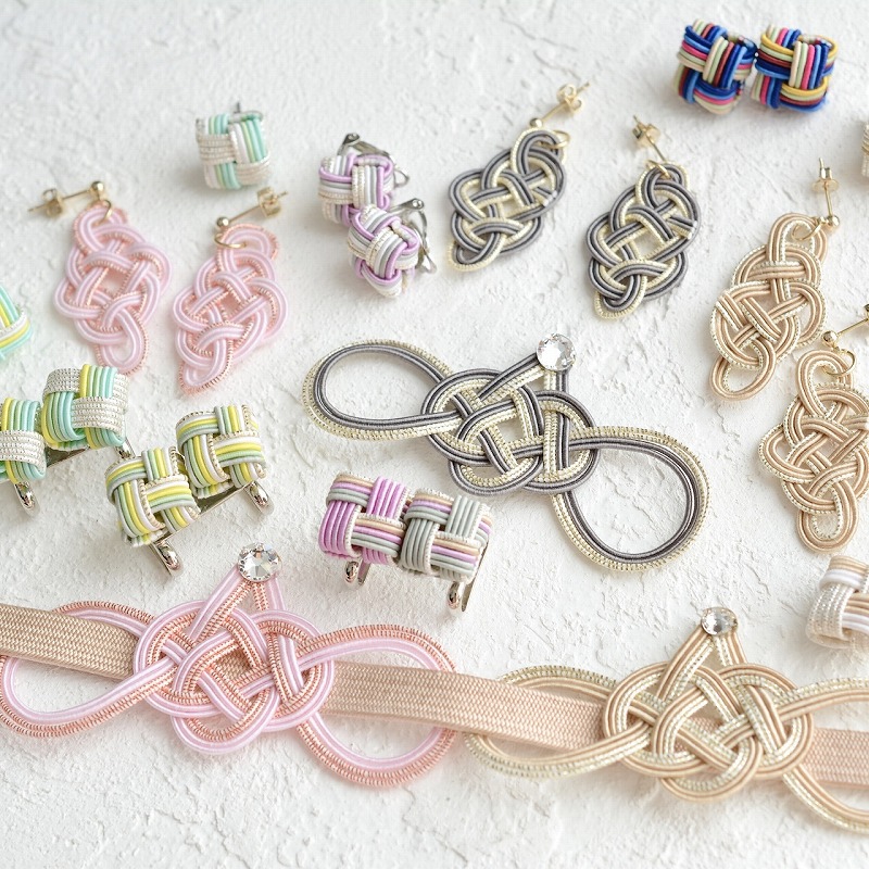 ご祝儀袋などに使われる水引で帯留、ピアス、イヤリング、根付などのアクセサリーを作ります。結び方は、市松模様or変わりあわじ結びのいずれか1種類です。お申し込みの際にどちらかご指定ください。