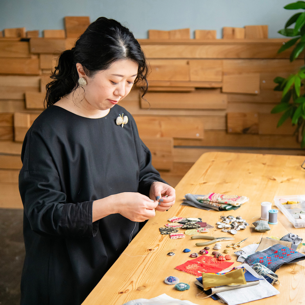 縁結びの神様、出雲大社のお膝元に位置する宍道湖。この宍道湖産しじみの貝殻を、お好きな布で縫い包んでいただき、オリジナルのアクセサリーを作ります