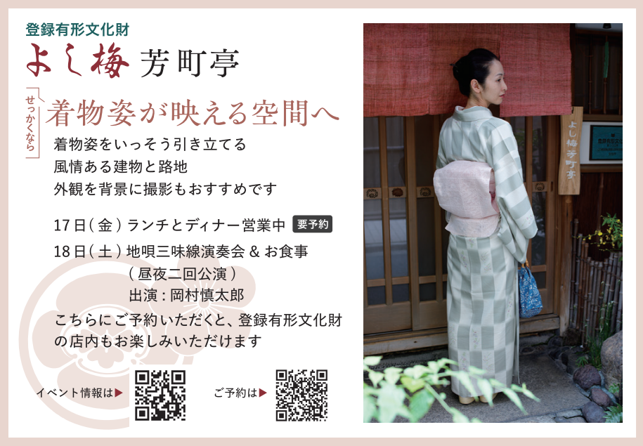 登録有形文化財に指定された建物と風情ある路地で、記念写真はいかがでしょうか。店内での撮影は、17日はランチかディナーをご予約のお客様、18日は文部科学大臣賞を受賞なさった、岡村慎太郎さんの地唄三味線演奏会にご予約いただいたお客様のみ、縁側や床間を背景に、素敵な着物姿を撮影していただけます。詳しくはWebサイトへ