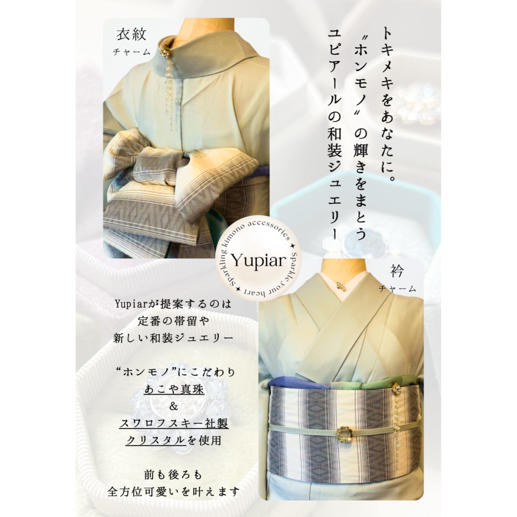“ホンモノ”の輝きをまとう、和装ジュエリーブランドのユピアールです。あこや真珠やスワロフスキー社製クリスタルを用いた衣紋チャームや衿チャーム、帯留めなどをお届けしております。ぜひぜひキラキラつやつやで美しいアイテムをご覧ください。